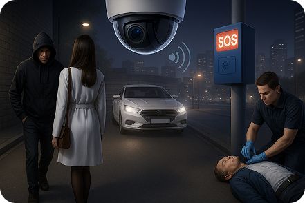 디밍기술을 활용한 가로등 밝기 조절로 어두운 지역에서의 접촉사고를 예방해주며 고화질 CCTV로 문제확인과 접촉사고 증거영상 확보에 큰 도움을 줍니다.